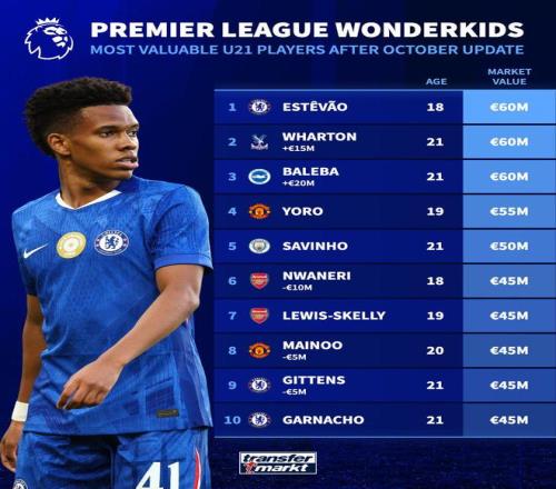 英超U21球員身價(jià)排行:埃斯特旺、沃頓、巴萊巴6000萬(wàn)歐居首