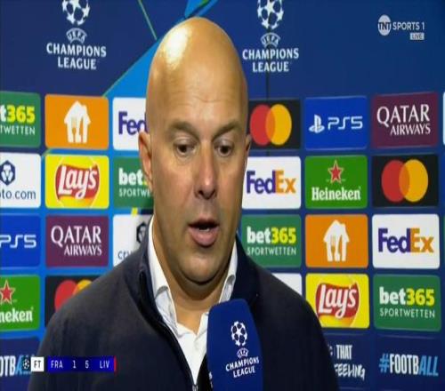 率隊在歐冠聯(lián)賽階段第3輪客場5-1大勝法蘭克福之后,利物浦主教練斯洛特接受了來自TNT體育的采訪。
