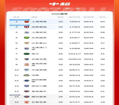 至此,本輪比賽,上海海港0分,成都蓉城1分,上海申花1分,北京國安0分。積分榜也因此有了微妙的變化,上海海港以60分繼續(xù)領跑,成都蓉城追了一分,以59分位列第2位。上海申花58分,繼續(xù)排在第3位。北京國安51分,維持在第4位。山東泰山47分排在第5位。