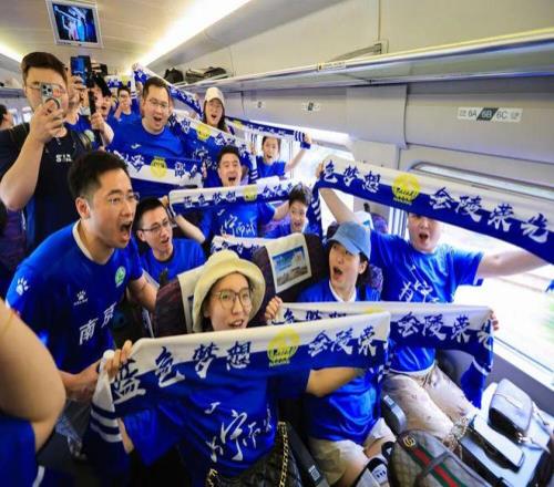 6月14日,球迷們在G9253次列車上合影留念。當(dāng)日,2025年江蘇省城市足球聯(lián)賽第四輪淮安隊(duì)對陣南京隊(duì)的比賽在江蘇省淮安市舉行,鐵路部門開行南京站往返淮安東站的長三角首趟“蘇超”球迷高鐵專列,方便南京球迷前往觀賽。新華社發(fā)(蘇陽 攝)