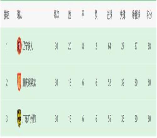 遼寧以68分成功拿到中甲冠軍,晉級到中超;重慶和廣州都是60分,前者以更少丟球成功攜手遼寧實(shí)現(xiàn)晉級。